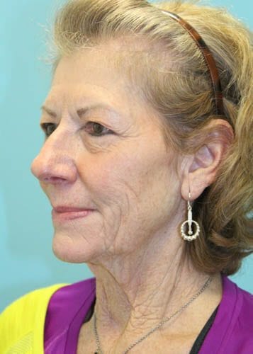 This woman is 70 years old asking for a more youthful appearance but natural. Significant excess skin of the neck is noted as well as jowls. After performing a standard two-layer facelift and neck lift, she achieved her desired outcome. She now feels she looks ‘great’ for her age group.