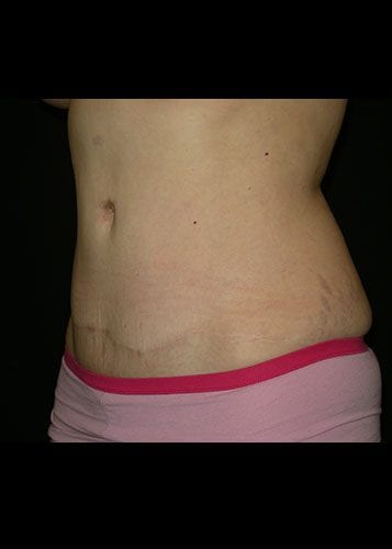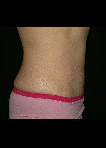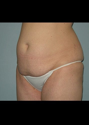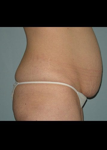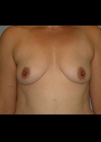 A 36 year old mother of two desired a ‘mommy makeover’. She wanted fuller and lifted breasts as well as a flatter tummy. Saline breast implants were placed behind the pectoral muscles through an incision at the areola border. A standard tummy tuck was performed as well. The muscle tightening from the tummy tuck gave her an excellent contour.